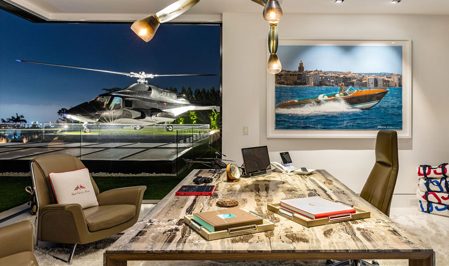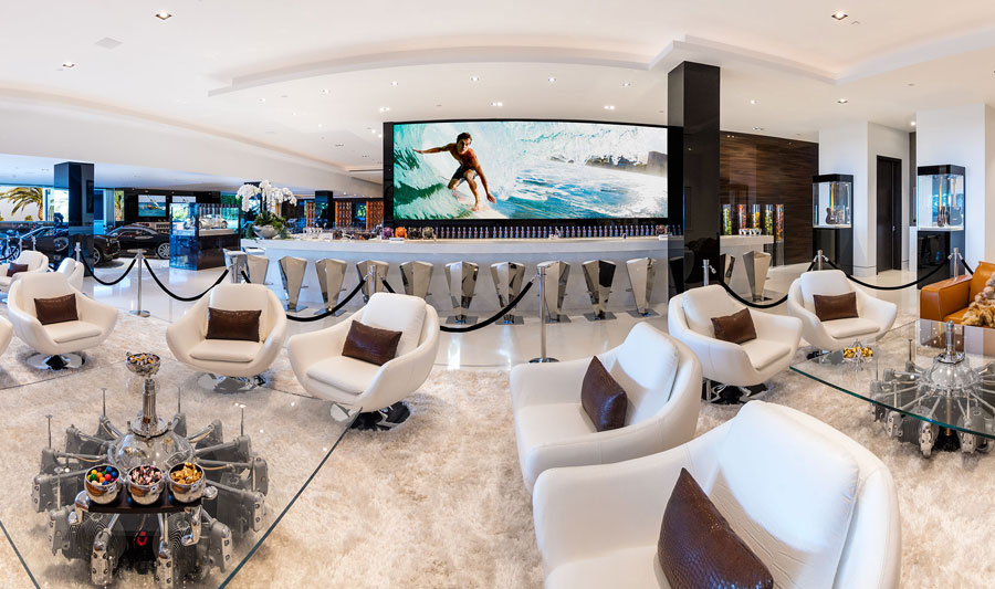 This triumphant marvel includes two master suites, 10 oversized VIP guest suites, 21 luxury bathrooms, three gourmet kitchens, five bars, a massage studio/wellness spa, state-of-the-art fitness center, and an 85-foot glass tile infinity swimming pool.